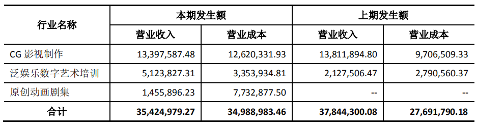 同样,主营业务未发生变化,但相应扩展了泛娱乐数字艺术培训,并新增了原创动画剧集业务的云图动漫也面临着成本的上升。报告期内,其原创动画剧集收入142.85万元,占总营收的4%。但与此同时,原创动画的成本也达到了773.29万,因此该业务的净利润实际为负数。