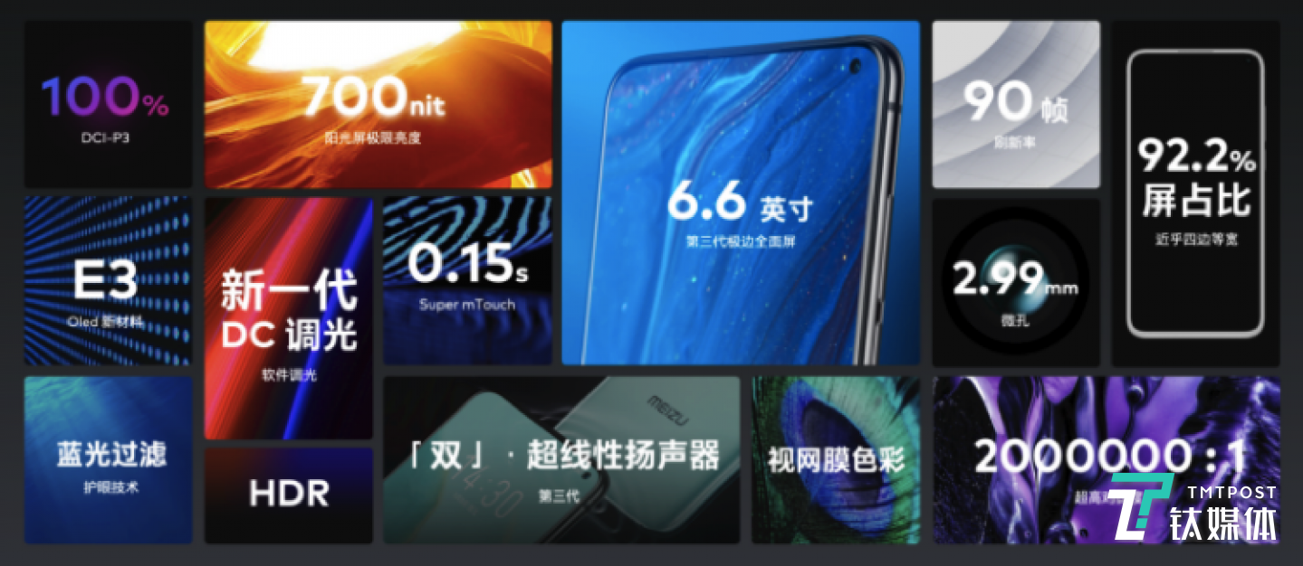 魅族 17 系列全系全量采用 6.6 英寸三星定制 Super AMOLED 显示屏,不仅采用了更为修长的 19.5:9 尺寸比例,更通过「COF」工艺实现了 3.3mm 的下巴宽度,令屏占比达到 92.9%,视觉上近乎四边等宽。