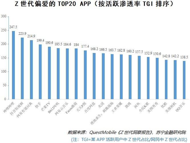 进一步地,我还可以针对Z世代用户偏爱的APP做一番考究。通过对Z世代活跃渗透率TGI指数(某APP活跃用户中,Z世代占比/网民中Z世代占比)这一指标的衡量,可以得到排名前20的APP种类(见下图)。