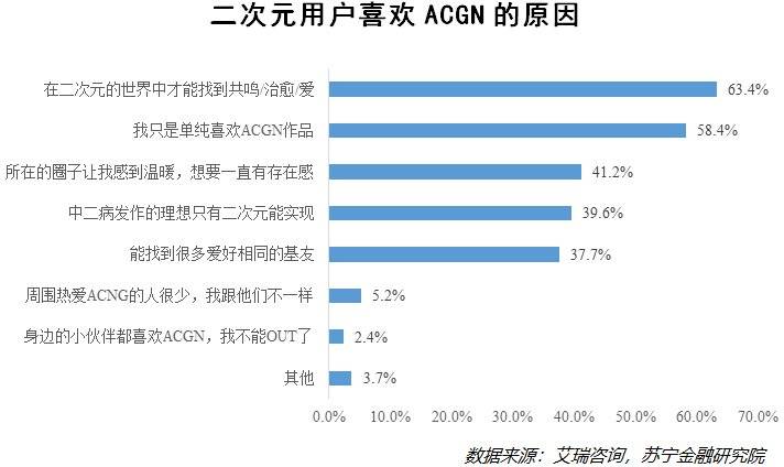 根据艾瑞咨询的调研结果,二次元人群钟情动漫是出于对快感和幸福感的积极获取,有63.4%的用户表示喜欢二次元主要是因为在当中能找到共鸣、治愈与爱,还有39.6%的用户表示“中二病”的理想仅能在二次元世界实现。这些还进一步投射出他们面对现实世界各种压力时,内心深处某种潜在的欲望和对难以实现的梦想的执着。