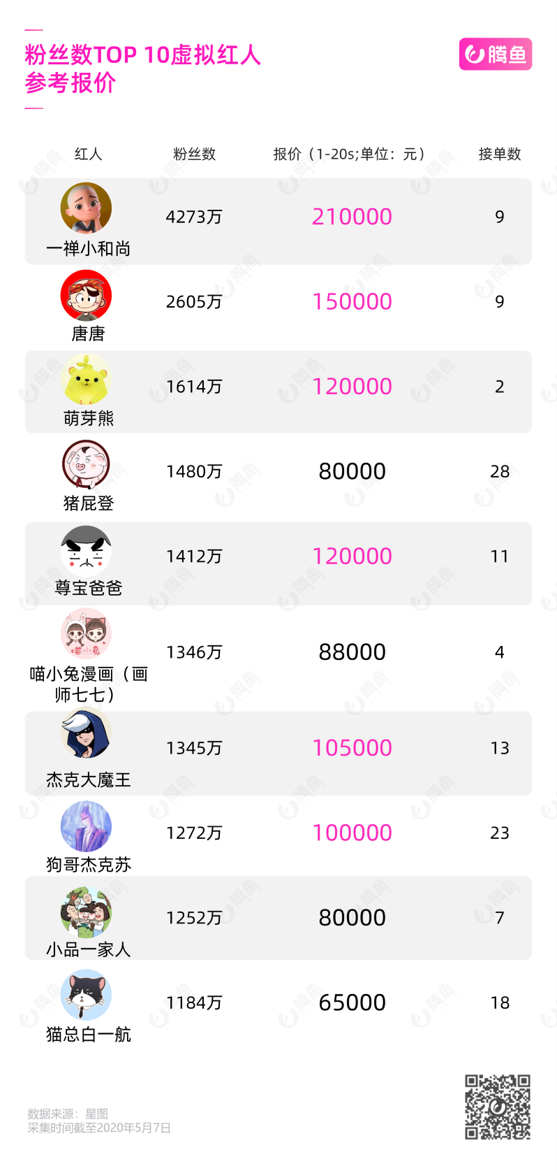 目前两位主播坑位费的真实性有待考证。但在带货上,虚拟红人的确已经逐渐和真人缩小距离。据抖音星图显示,二次元“动画动漫”头部红人中报价最高的是“一禅小和尚”,单条视频21万,已高出美食头部红人“翔翔大作战”6万。