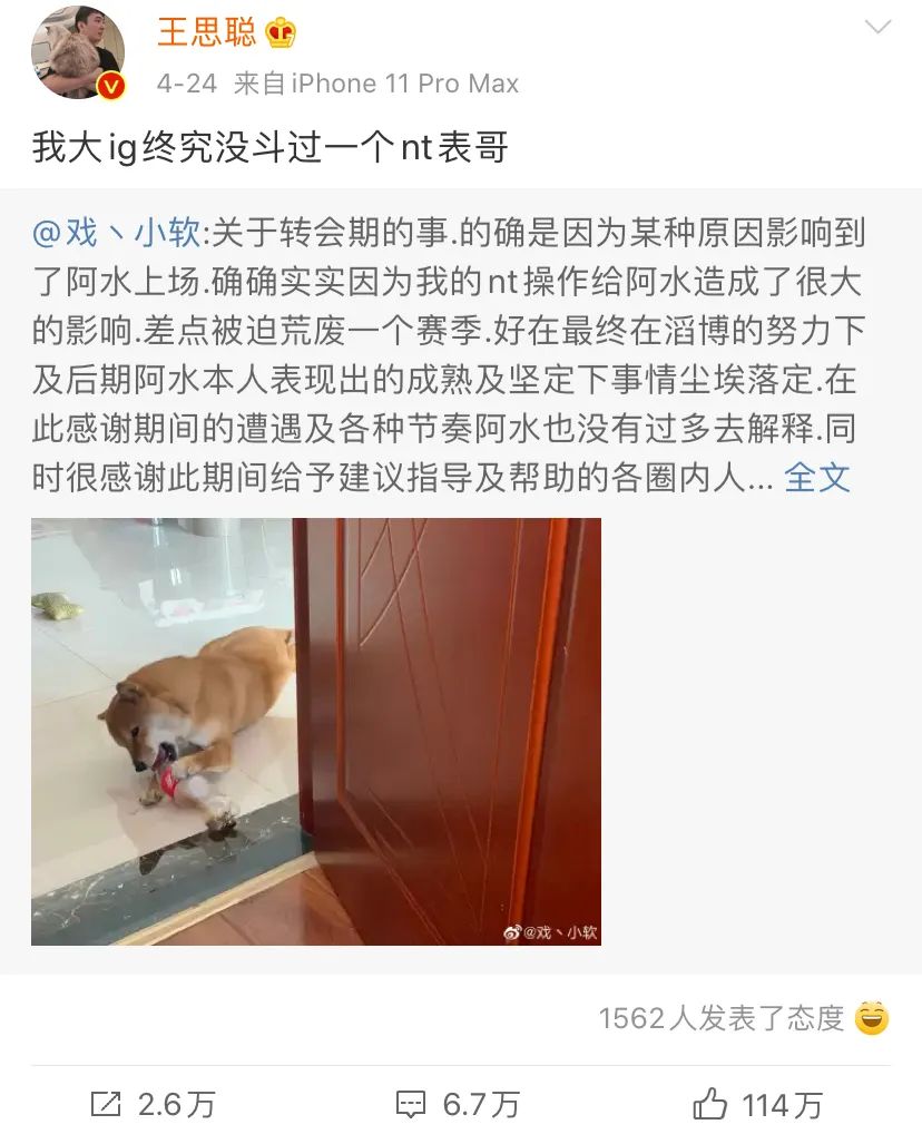 今年,Jackeylove的转会便卷入了多家俱乐部,以Jackeylove表哥的爆料来看,Jackeylove或被RNG/SN的意向合同所坑,成为受害者,只能自付违约金再签约下家,但从王思聪微博来看,问题核心则出在Jackeylove表哥身上,因为其坐地起价遭联盟多数队伍抵制,Jackeylove只能签约滔博。