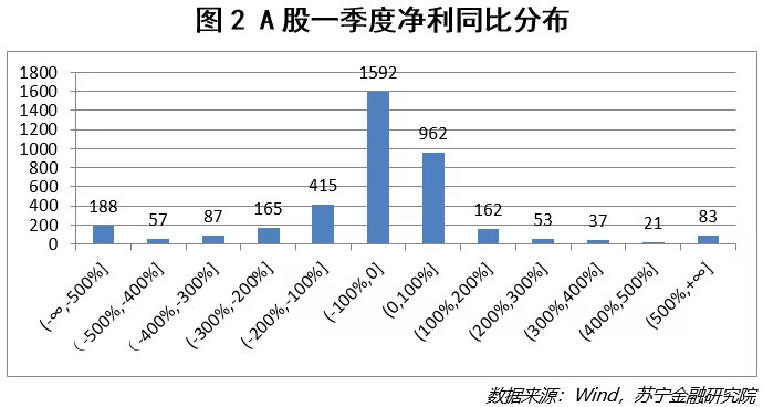 在新冠疫情冲击、原油价格暴跌、全球经济疲软等因素的影响下,封锁措施对企业经营造成了极大的影响。比较来看,今年一季度的利润回撤仅次于2018年四季度业绩大洗澡时的同比下跌43%,疫情对于实体经济的不利影响从一季报中可见一斑。从净利润同比分布来看(见图2),一季度呈现出了明显的左偏、厚尾的特征,有912家企业同比下降超过100%。