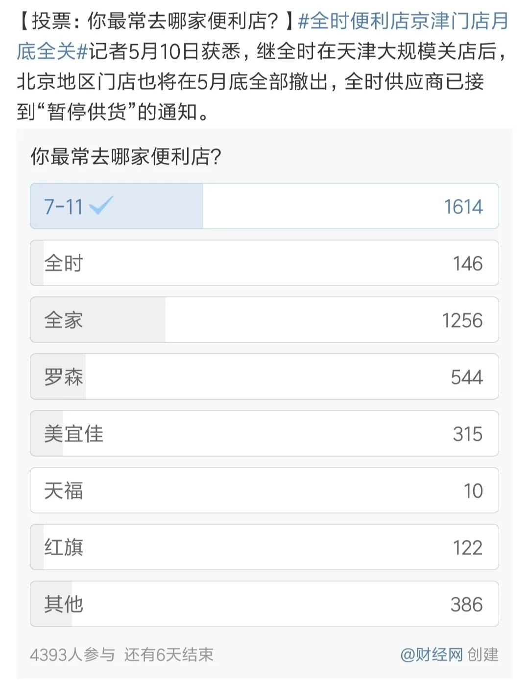 在微博上一项“你最常去哪家便利店”的投票中,有1614个人投给了7-11,1256个人投给了全家。而仅有146个人投给了全时。