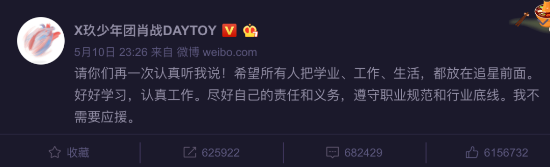 5月10日23点26分,肖战微博发文回应此事,“请你们再一次认真听我说!希望所有人把学业、工作、生活,都放在追星前面。好好学习,认真工作,尽好自己的责任和义务,遵守职业规范和行业底线。我不需要应援。”随后“我不需要应援”登上微博热搜榜第一、抖音热搜榜第三,分别在榜14小时和12小时40分,可见其引发的舆论关注度。