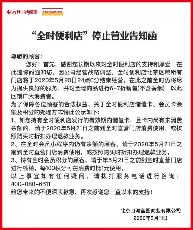 5月11日,北京全时便利店通过官方微信公众号发布停止营业告知函,称因公司业务战略调整,全时便利店北京区域所有门店将于5月20日24时结束经营,全场6-7折。