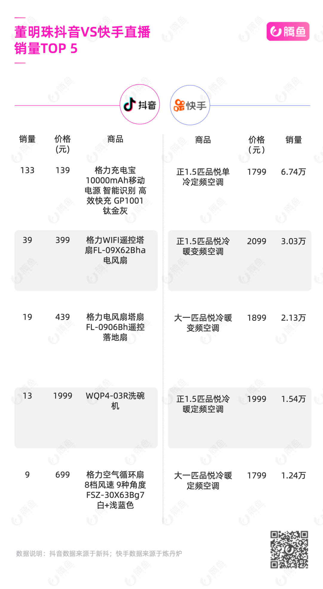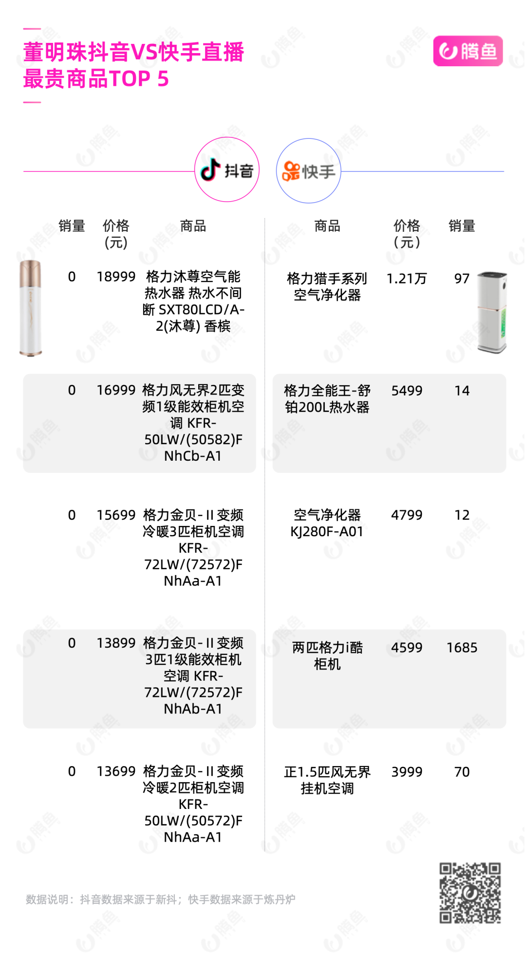 回顾之前的抖音直播首秀,董明珠的选品多集中在2000-10000元的中高价位,还选择了8款万元商品。超高价与直播间的打折、促销气质并不相符,当时甚至有网友在弹幕中发出了“不打折”的质疑。