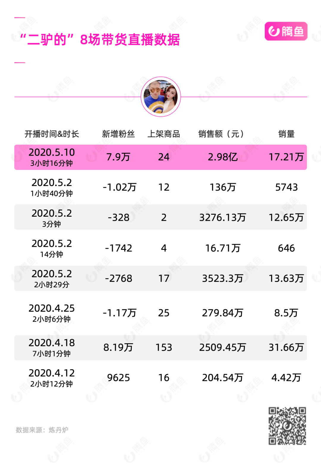 董明珠和快手头部红人联手,是一次双赢。从二驴近几场带货直播来看,董明珠的到来给他增加了人气和销量。本场直播后,二驴增粉7.9万,仅次于4月18日那场7小时的直播。本次直播2.98亿(本数据为炼丹炉监测数据,官方战报数据为3.1亿)的销售额远超其他场次。