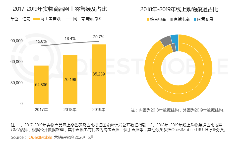 QuestMobile数据显示,2019年,中国社会消费品零售总额增速8%,已经突破41万亿(与美国相差微弱),如果谁还认为内需市场不值得深挖,Mr.QM只能说好走不送了,这当中,网络消费仍旧保持了较高的增速,突破了8.5万亿,其中直播电商、闲置交易等渠道的占比正在上升。