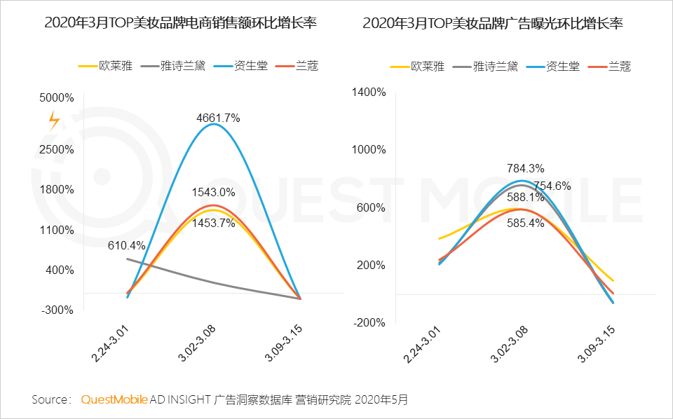 2020年3月美妆销售爆发增长,尤其女人节活动销售大幅增长。同期,广告投放、直播同步推进。美妆行业整体销售呈现受大促带动的趋势,直播亦是重要手段。