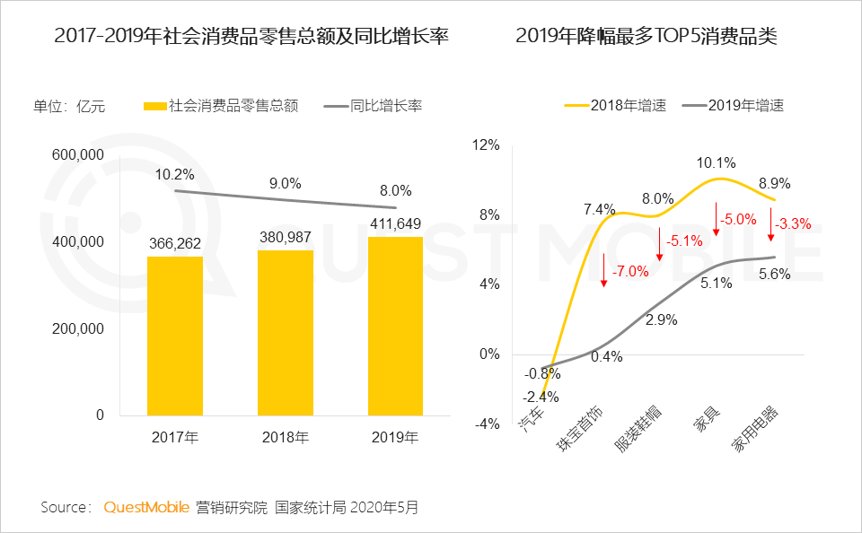 1.1 2019年中国消费市场增速放缓,汽车行业持续负增长,服饰类市场接近饱和