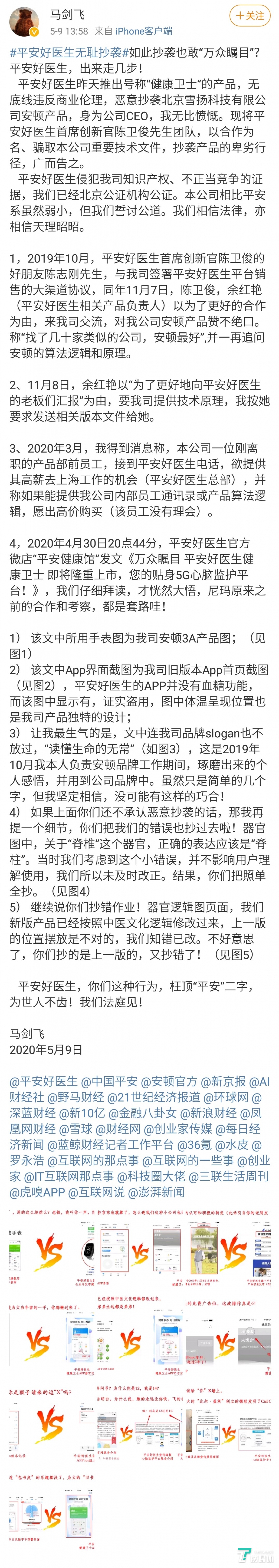 雪扬科技CEO马剑飞微博发布长文控诉平安好医生健康卫士抄袭