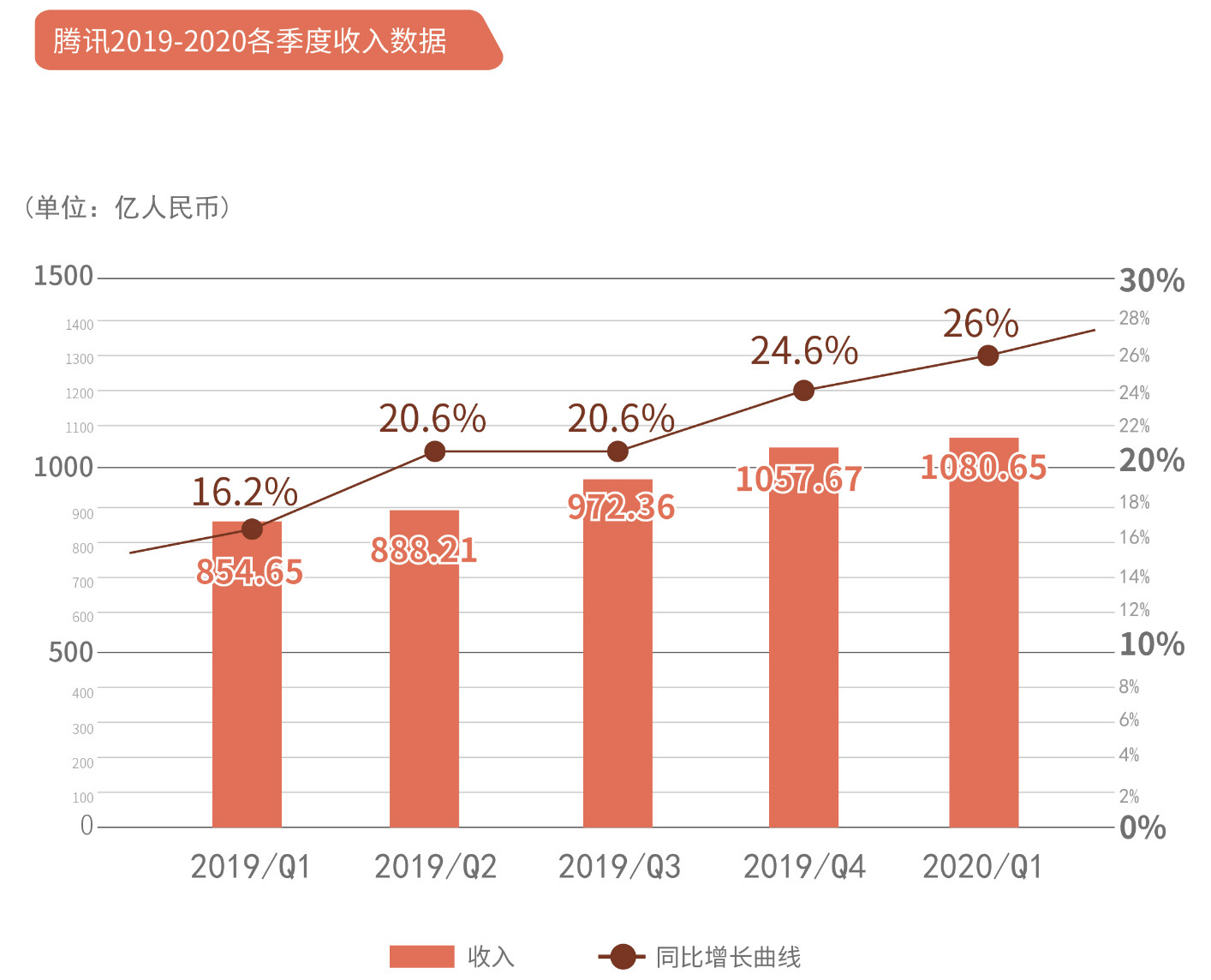 通过横向对比腾讯2019—2020各季度营收数据,可以发现自发力产业互联网以来,腾讯一直保持着较快的营收增速。如图,2019年Q1营收同比增长16.2%至854.65亿元,2020年Q1营收同比增长26%至1080.65亿元。