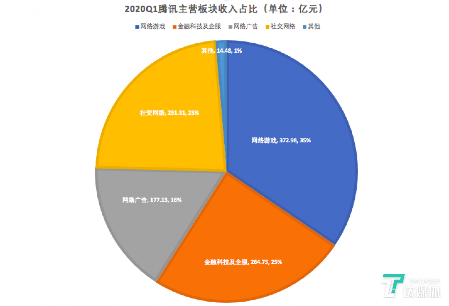 从业务板块来看,腾讯按业务划分的收入共分为:增值服务(网络游戏+社交网络)、金融科技及企服和网络广告(社交及其他广告+媒体广告)三大块。以下为2020年Q1季度腾讯各业务线的具体财务业绩。