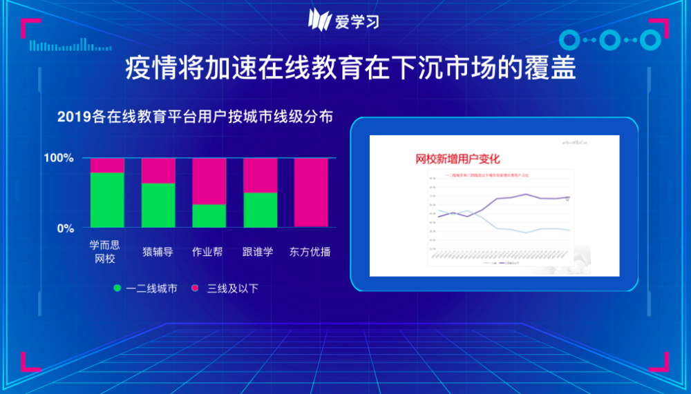 虽然近3个月线上学习让一些家长和学生产生了逆反心理,但不可否认的是,头部在线教育公司这波免费课程及在品牌上的投入,确实加速其向下沉市场的渗透。作业帮和猿辅导都公开表示,在推出免费直播课的2-3天内,其报名用户数就迅速突破了1000万。