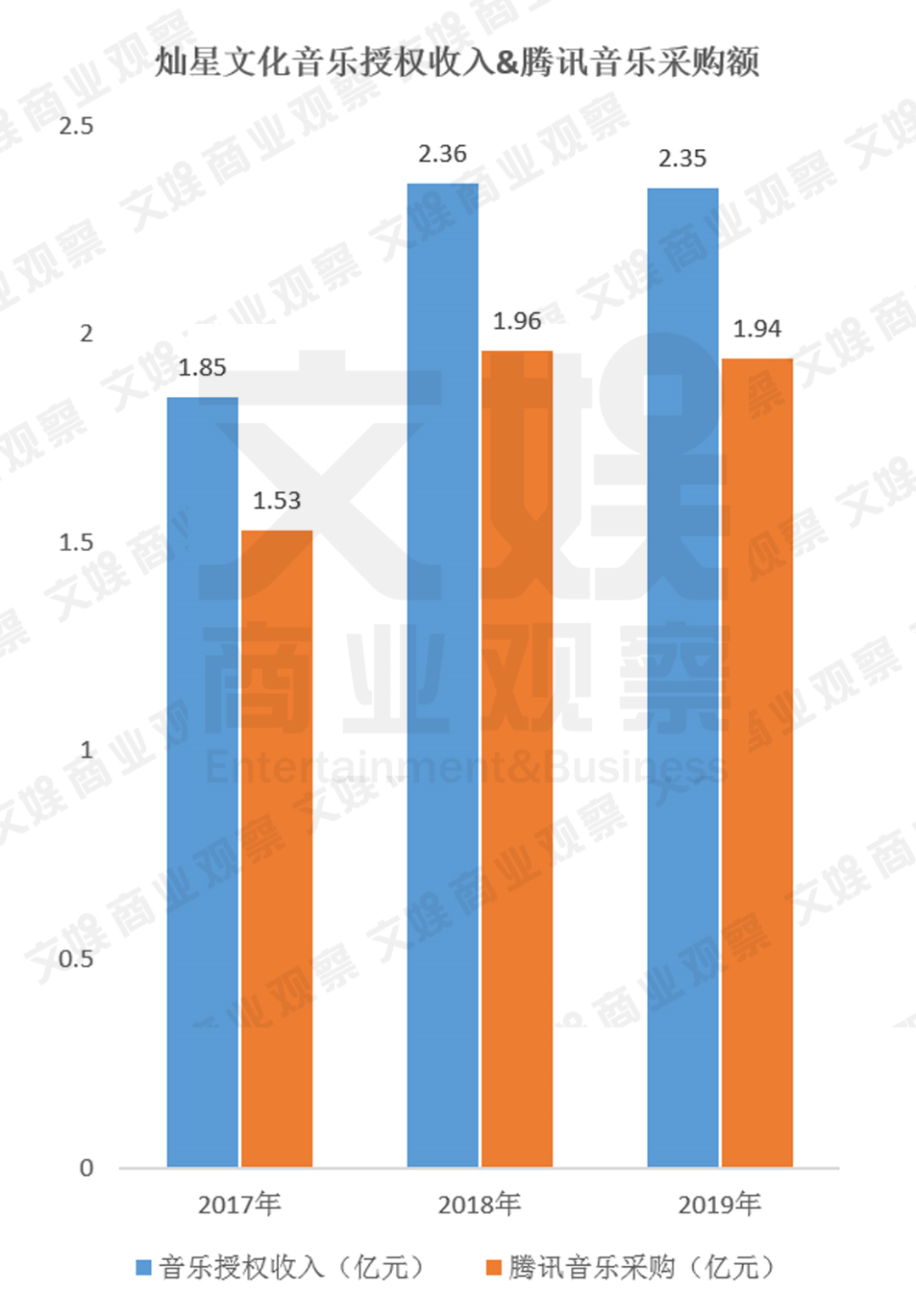 音乐版权授权业务是指灿星文化通过制作音乐节目,以及为签约歌手制作歌曲,沉淀了大量音乐版权。通过授权互联网音乐平台等其他音乐内容需求方,获得授权收入,2017年、2018年和2019年分别收入1.85亿元、2.36亿元和2.35亿元。