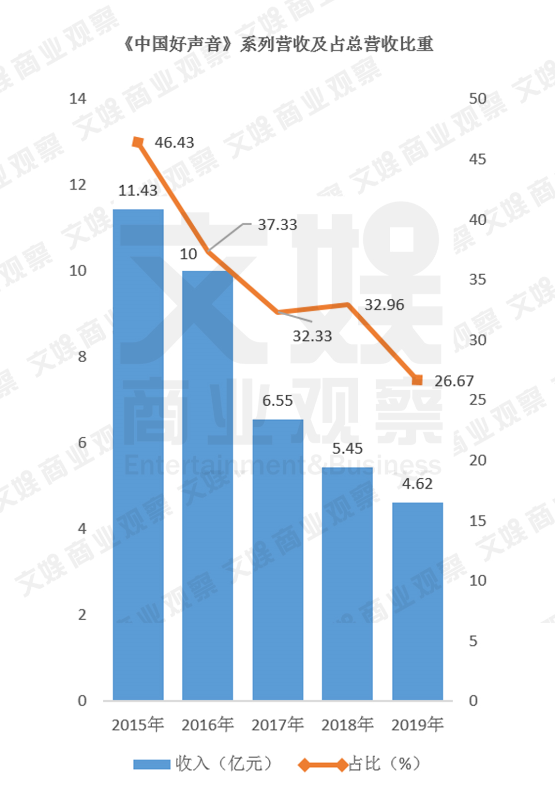 招股书资料显示,《中国好声音》和《中国新歌声》在2015年收入为11.43亿元,2016年收入下降至10亿元,2017年收入进一步下降至6.65亿元;2018年下降至5.45亿元,;2019年再下降至4.62亿元。