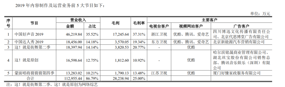 资料显示在灿星文化2019年前五大收入项目中,台综《中国好声音2019》的毛利率为37.31%,远高于视频网站S级项目《这!就是街舞》第二季的20.77%;台播综艺《中国达人秀2019》和《蒙面唱将猜猜猜第四季》也高于网综《这!就是原创》10.92%的毛利率。