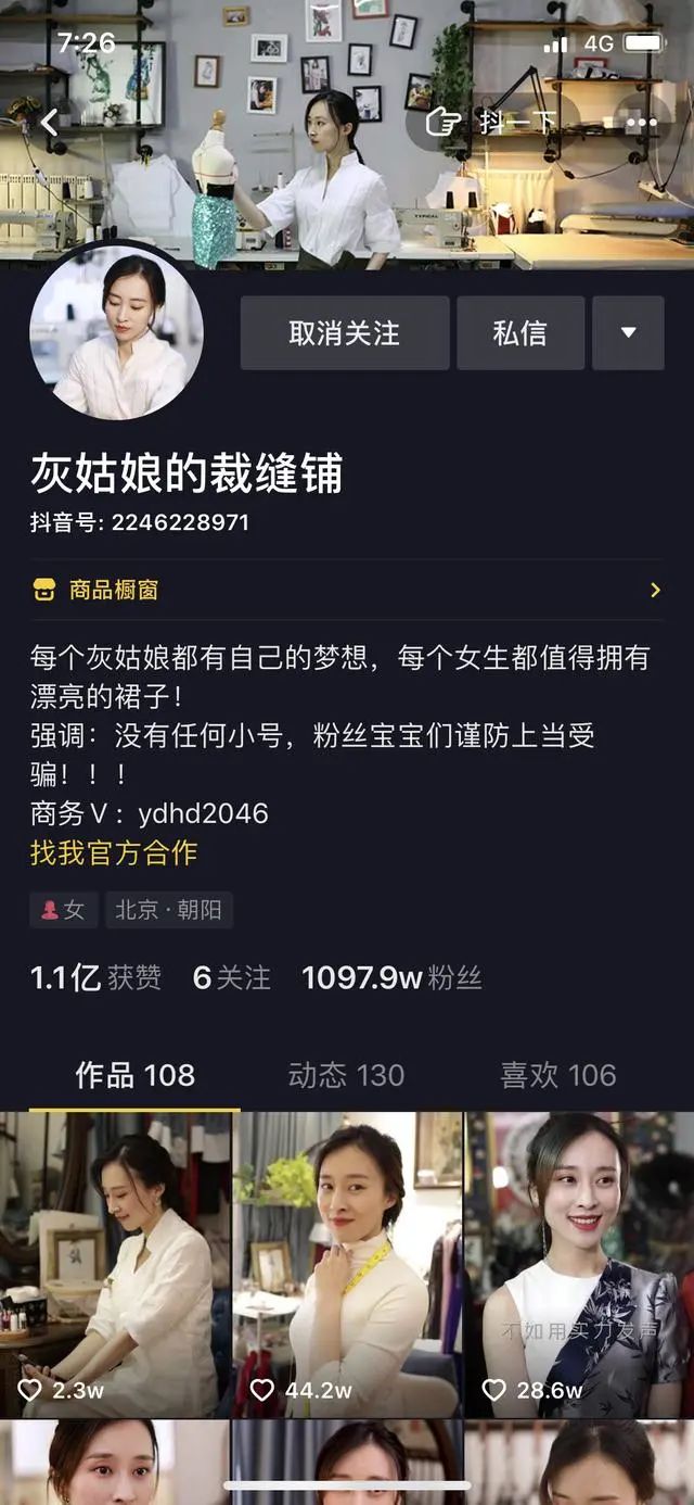 有了在《奇葩说》出演短剧的经历,再加上自己对于服装设计的喜爱,2019年4月,"灰姑娘的裁缝铺"发布了第一条单集短剧。如今账号已获得1097万粉丝,累计1.1亿个赞。