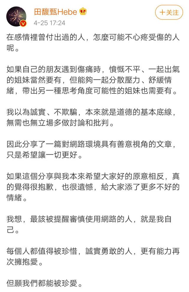 例如前阵子沸沸扬扬的罗志祥与周扬青分手事件,从郑爽到陈学冬的系列发言,再到张雨绮剪八爪鱼内涵,无一不是对周扬青的支持。而田馥甄因转发邓惠文医师的带有“舆论公审的武器,可用于正义,也可用于私仇”观点的逆风文章,被质疑为“挺猪派”。虽然田馥甄的回应中表示对此事中立,但在罗志祥形象瞬间崩塌的当下,已无人肯认她的所谓“中立”,遭到网友抵制,甚至扒出了她多年前的黑料言论,据传,田馥甄为此丢了两个代言,不过并未得到证实。