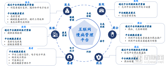 互联网慢病管理平台依托于互联网医院,由线上的专科医生为慢病患者提供在线复诊、开具电子处方、患者数据监测、用药指导、定期回访及慢病干预等诊疗管理服务。