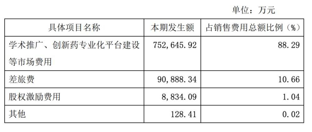 从销售费用具体构成来看,其中,“学术推广、创新药专业化平台建设等市场费用”为75.3亿元,占比88%以上,相比去年54.24亿元增加了21亿元;“差旅费”9亿元,占比10.66%,和去年基本持平;“股权激励费用”为8834万元,占比1.04%。