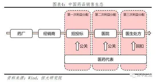 研报中引用了一份调查,称销售费用主要有六大流向:公关招标机构费用、公关医院相关负责人费用、医生回扣、医药代表提成、逃税洗钱(过票)成本、统方费用。其中,利益进行三次重新分配,且医生回扣占比超过一半。