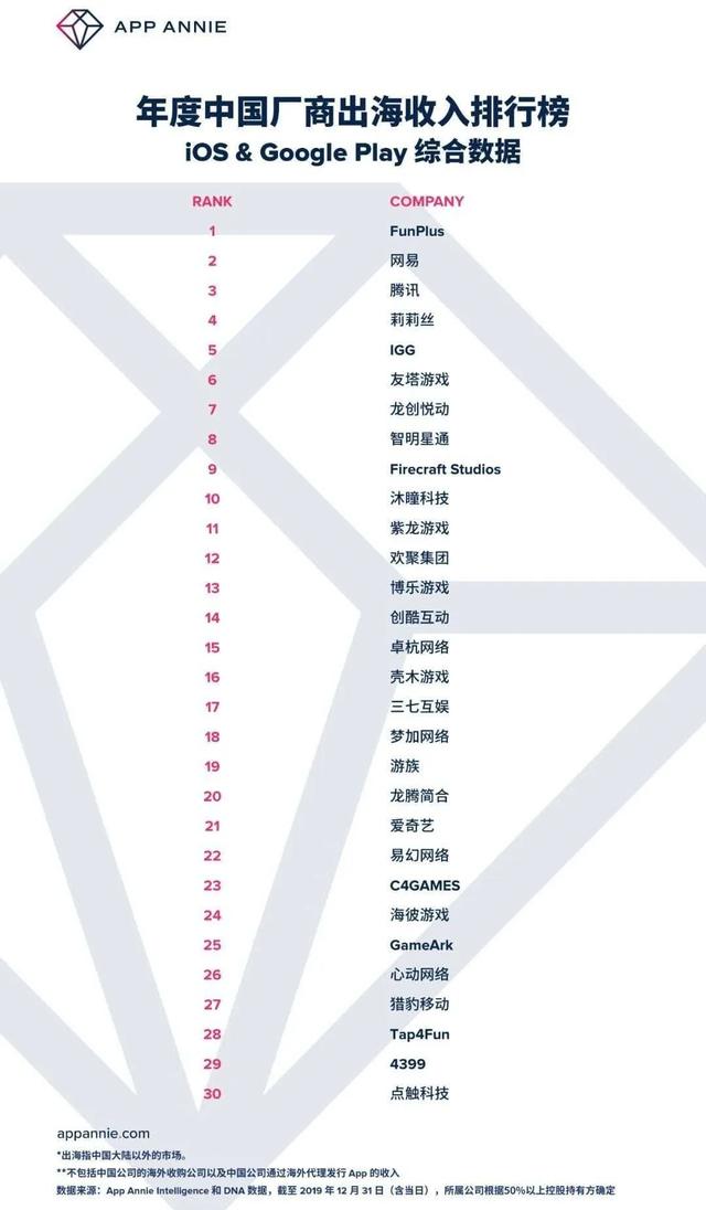 在此之前,App Annie也发布了一份2019年中国手游厂商出海TOP30榜单,FunPlus、网易、腾讯、莉莉丝、IGG五家游戏厂商分列前五位。