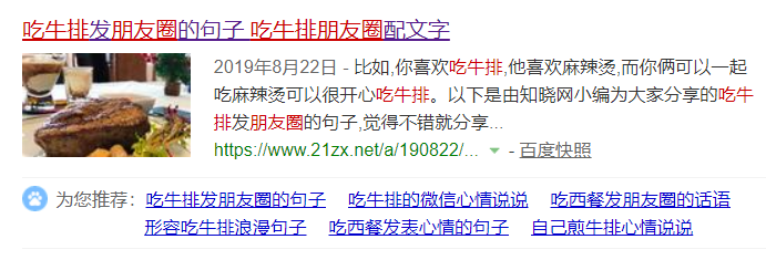 为了让秀恩爱配得上牛排的X格,贴心的搜索引擎还能为你提供贴心的朋友圈配文指南。