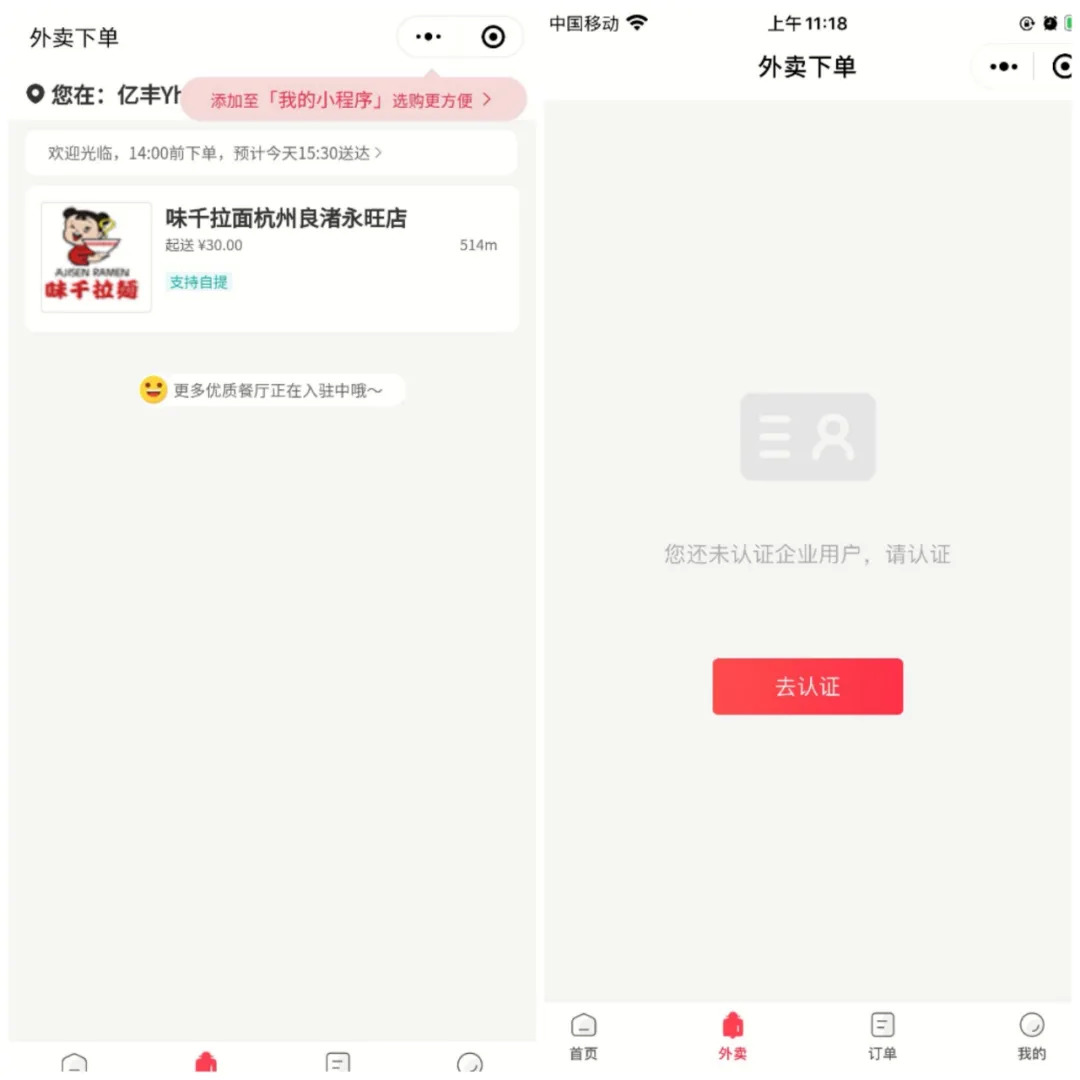 不过,这一功能在5月12日突然关闭,如今再进入外卖下单页面,只允许合作企业的员工在认证后进行下单。