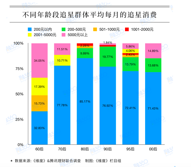 在融360《维度》联合腾讯理财发起的一项《追星群体中到底有多少人愿意为偶像买单》的调查问卷中, 69%的粉丝都曾为偶像消费,其中4.67%的追星族平均每月为偶像花费超过5000元。其中一个有意思的结论是,有三成以上(34.05%)的60后,每月为追星消费超过5000元,比例远超过其他年龄层粉丝。