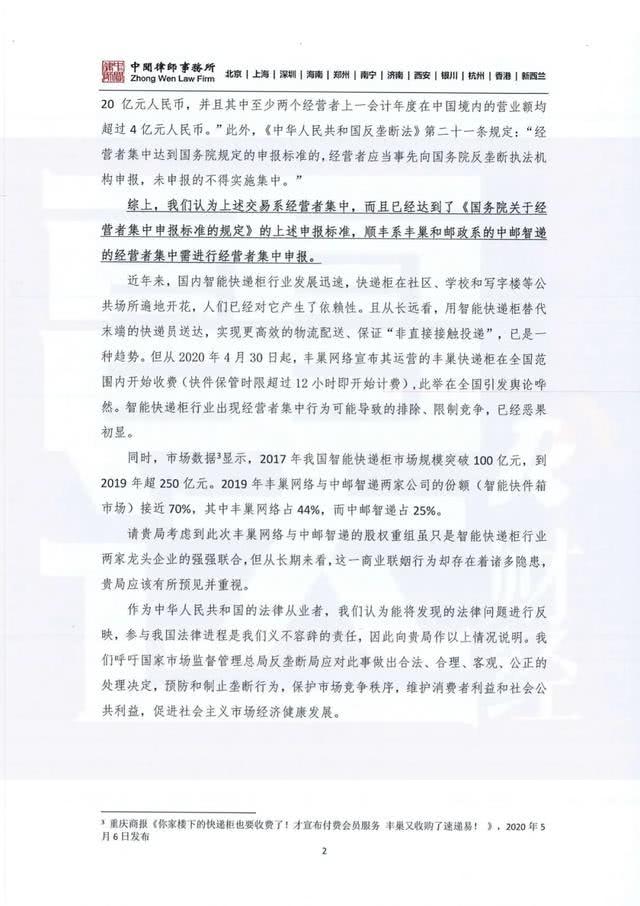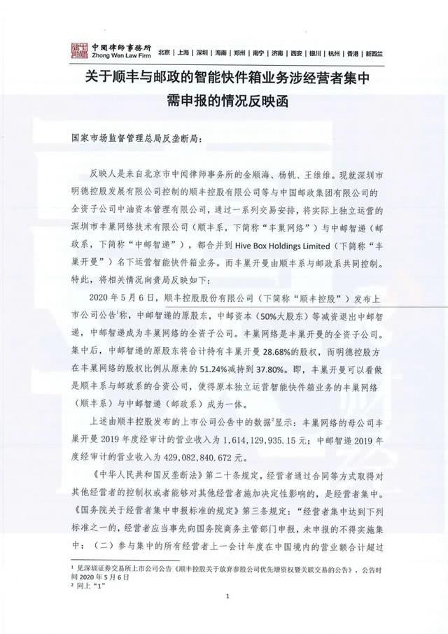 5月13日下午,雷达财经获悉,北京市中闻律师事务所的金顺海、杨帆、王维维三位律师就深圳市丰巢网络技术有限公司(下称"丰巢公司")与中邮智递科技有限公司(下称"中邮智递")的股权重组事宜,向国家市场监督管理总局反垄断局反映该项并购涉嫌未依法进行经营者集中申报。目前,该举报信已寄出。