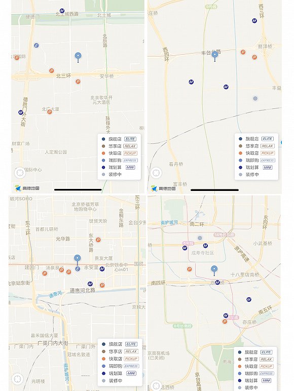 界面新闻以北京德胜门、永安里、肖村桥、丰台北路4个分布于北京不同方位的地名定位,发现瑞划算(M)机器已经被纳入定位系统,此外,小鹿茶的新开门店也同样被显示在瑞幸APP或者小程序中,因此瑞幸咖啡的新开门店数字里,很可能也包括了无人售货机、无人咖啡机以及小鹿茶门店。