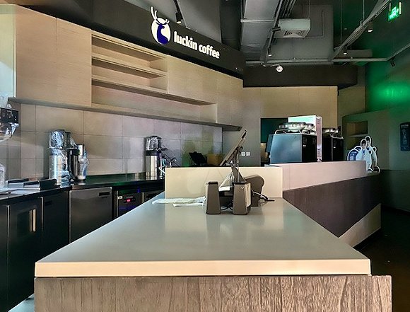 鸿坤广场这家瑞幸咖啡便是从4月14日开始停业的。在同一时间点关张的,还有位于丰台科技园区汉威国际广场1区B1层一家瑞幸咖啡。界面新闻注意到,后者的店铺内并未撤去店标,店内吧台上2台咖啡机和打印订单的机器仍在,就连吧台下方的冷柜也仍然亮着灯。附近的店家告诉界面新闻,这家瑞幸已经关闭15天左右,原材料基本也撤了,原因是“无照经营”。