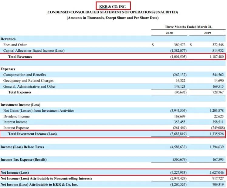 财报显示,2020年第一季度,全球私募股权投资巨头——KKR投资亏损42.6亿美元,几乎将2019年全年的净利润(46亿美元)全部亏完,创下自2009年上市以来最差的单季度业绩。