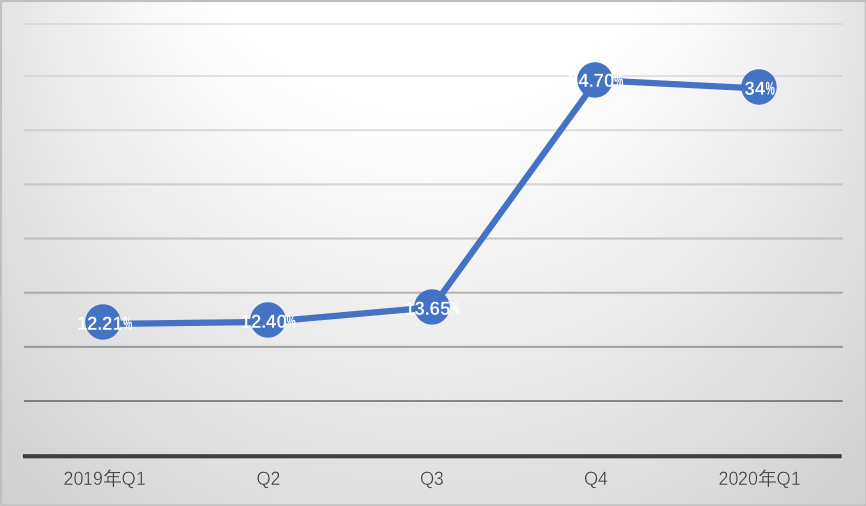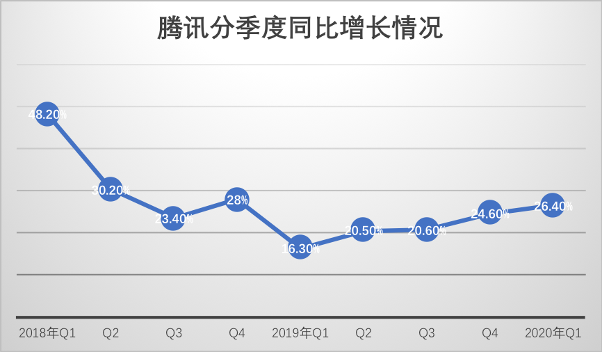 2020年Q1,腾讯总收入达到了1080.65亿元,同比增长26%,对于腾讯,这是一个相当不错的成绩,我们整理了2018年Q1-2020年Q1分季度的同比增长情况,见下图。