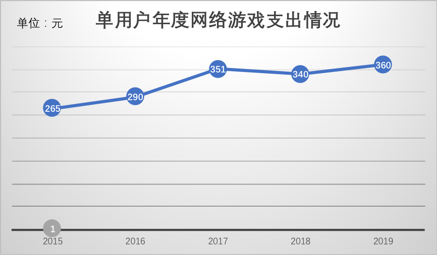 根据中国音数协游戏工委历年的游戏产业报告,我们测算五年以来国内市场单用户的网络游戏支出情况,见下图