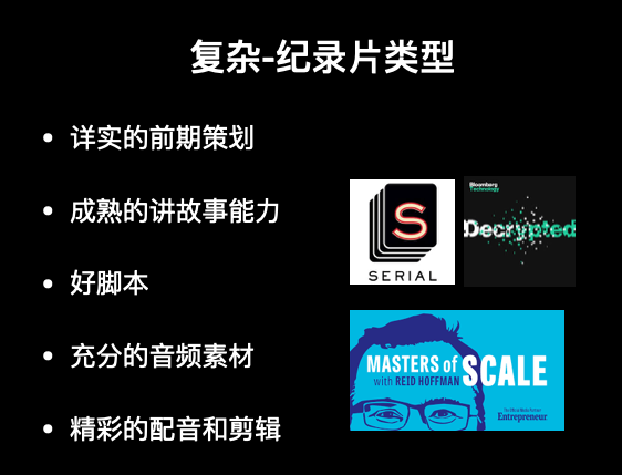 接下来还有一种类型,就更加复杂的,看起来就像是有声纪录片,你需要去策划、讲故事,需要好的脚本、充分的音频素材,就像做电影和纪录片一样。2014到2015年,引爆整个播客市场的Serial,就是这样的节目,我们称之为有声犯罪纪录片这样的音频节目。