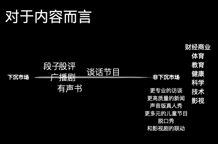 对于内容制作者而言我会说,中国现在是下沉市场的内容更多,比如比较容易制作的段子、股评、配音的广播剧、制作未必那么精良的有声书,还有比较容易录制的谈话节目,就这些。市面上都有。对比美国的话,还有很多可以探索。比方说,哪里有更加专业的访谈?高质量的新闻在哪里?声音版的真人秀,或者是更加多元的儿童节目、脱口秀,还有像HBO那种影视的联动。