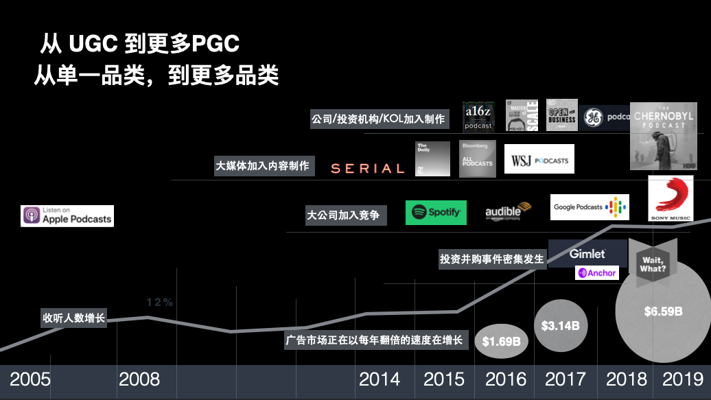 引爆市场之后,它的成熟度表现在,很多大公司加入了竞争,平台有Spotify、Amazon、Google、Apple、Sony Music。再到内容这一端,有很多传统的、非常善于制作内容的大媒体也加入了制作,像纽约时报、Bloomberg、华尔街日报,还有HBO。除此之外,投资机构和小公司加入,大的消费类公司也加入了,市场上的内容品类就非常丰富。市场上还有成熟的并购和投资事件出现。