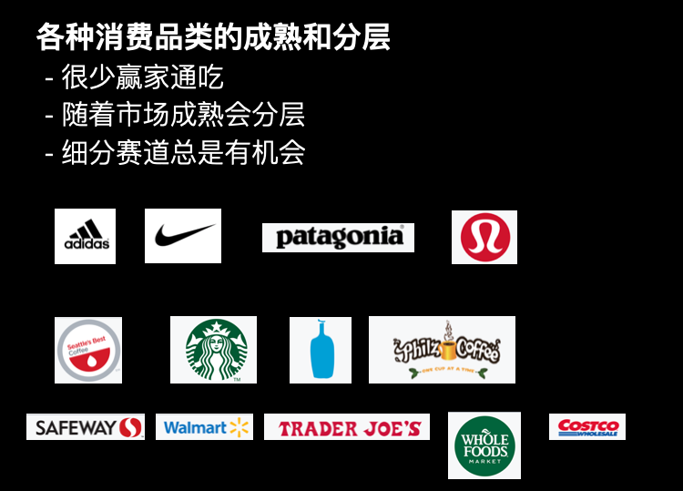 比方说阿迪达斯跟Nike,已经在这个市场上存在了五六十年,甚至更长时间。但是像细分的户外品牌Pantagonia,大家还是非常喜欢它。包括最近在中国、美国都非常火的Lululemon,也是一个异军突起的的品牌。咖啡领域,我们看1970年、1971年,Starbucks已经占领了很大的市场,做得非常大。