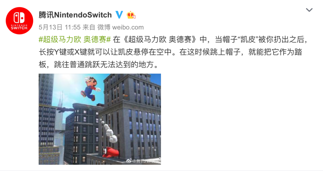 官方账号最新发布的一则微博介绍了《超级马力欧 奥德赛》中的一个游戏技巧:当帽子「凯皮」扔出去的时候,长按Y键或X键可以让帽子悬停,这时候玩家可以跳上帽子,将其作为踏板,跳往普通跳跃无法到达的地方。