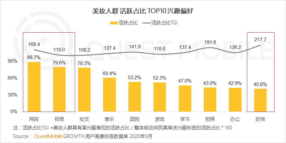 4、网购、视频是美妆人群最典型的两类兴趣,且时尚偏好显著,印证此人群易被“种草”、易“剁手”
