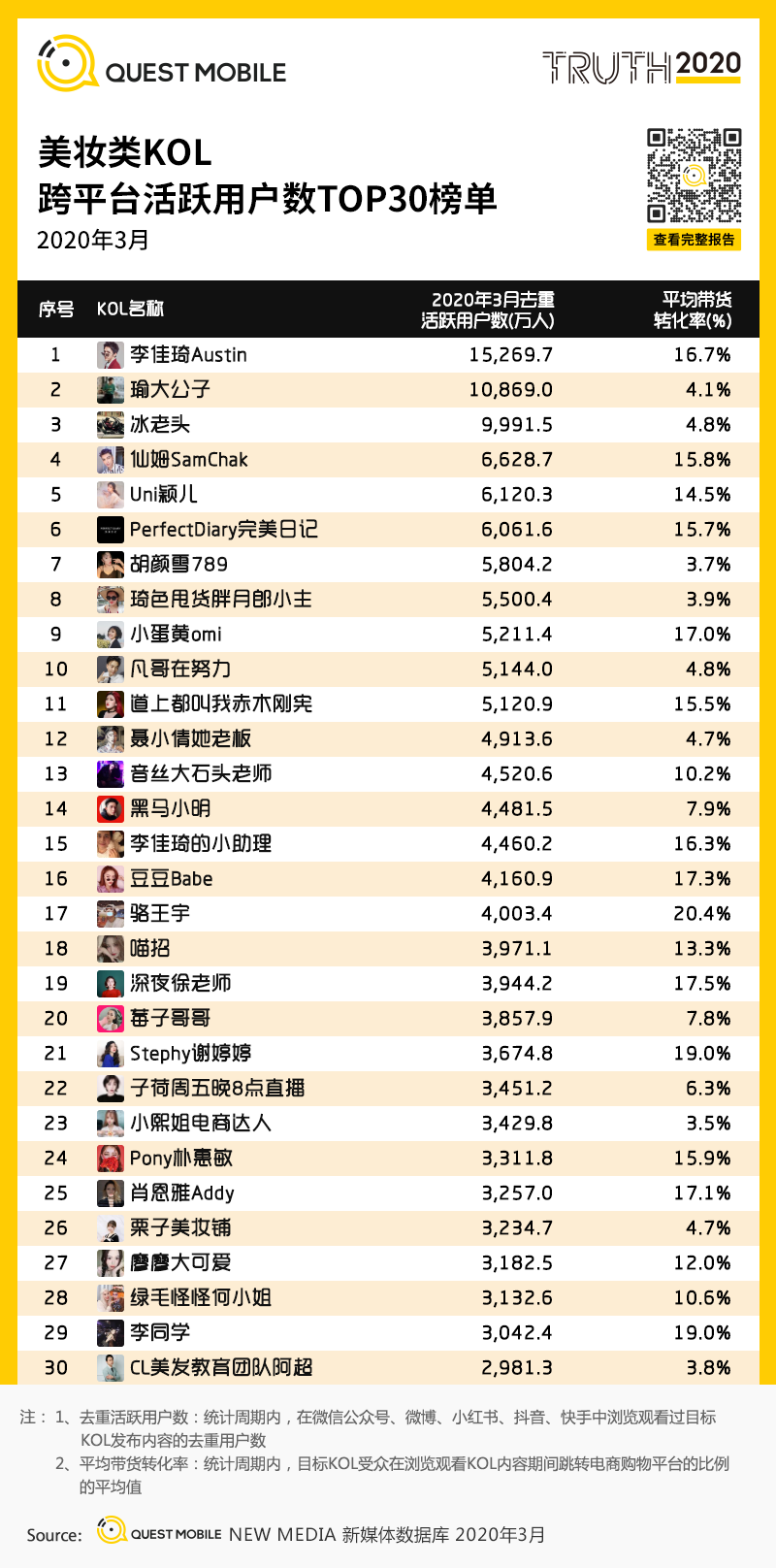 6、美妆KOL 去重活跃用户数 TOP30榜单