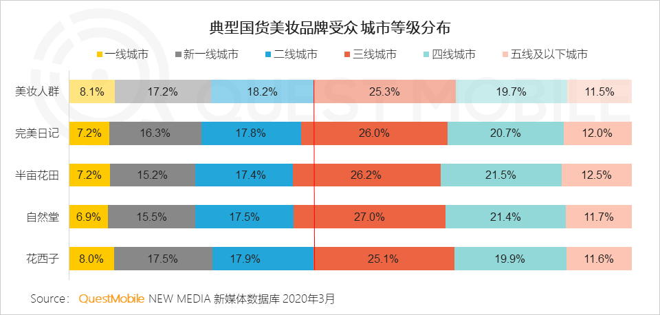 3、典型国货品牌的受众相比于总体人群,25岁以下、三线及以下城市的受众占比更高,国货通过进军下沉地区、年轻人群实现了对欧美品牌的突围