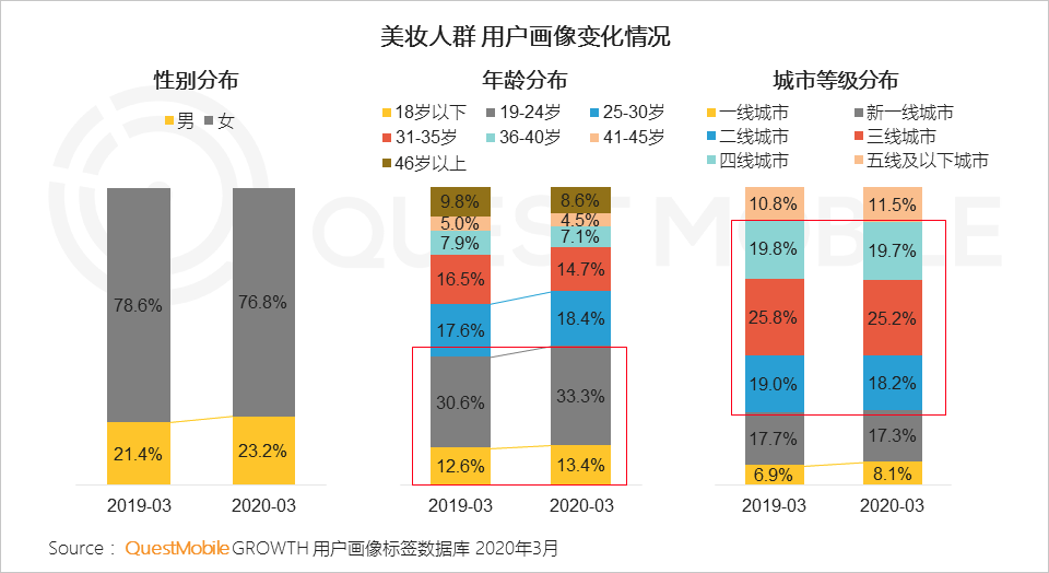3、美妆人群的基本盘是二三四线城市的年轻女性,25岁以下年轻人群规模呈现出进一步增长趋势,男性人群占比也有所上升