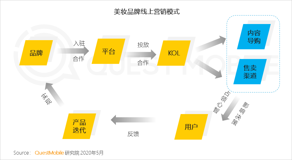 1、美妆品牌线上营销的主要模式是与不同平台的KOL开展合作,利用其内容与渠道二合一的属性,占领用户心智,影响消费决策,再通过用户的反馈迭代产品