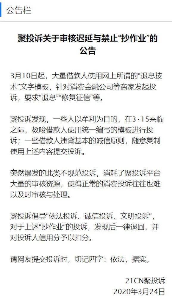3月,聚投诉发布了一则公告,称3月10日起,大量借款人使用“退息技术”文字模板,对消费金融公司发起投诉,消耗了平台的审核资源。