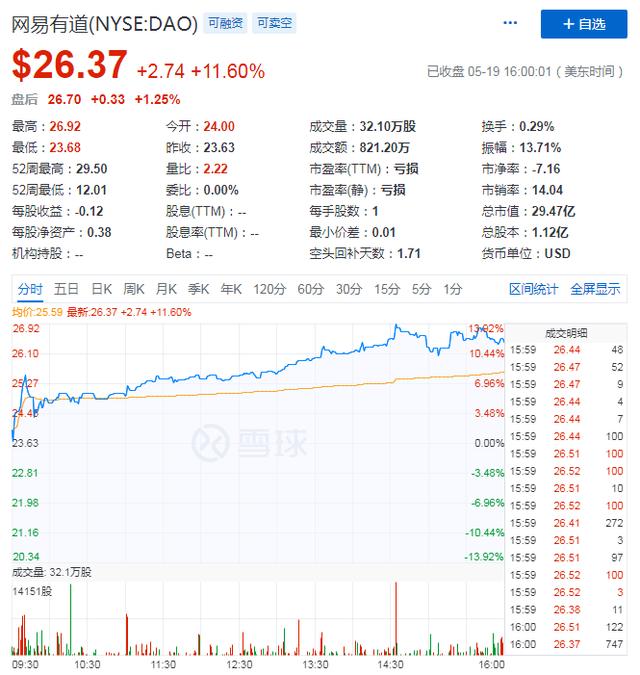 受财报发布之后的影响,截止文章发稿,网易有道的盘后股价为26.70美元,盘后股价上涨1.25%,市值为29.47亿美元。