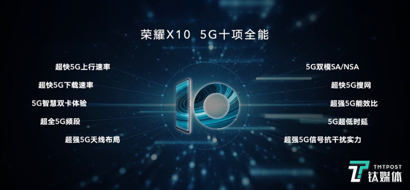 钛媒体5月20日消息,荣耀旗下首款X系列5G手机荣耀X10正式发布,这款手机以“超能科技”为宣传语,主打同价位旗舰级的5G通讯体验。